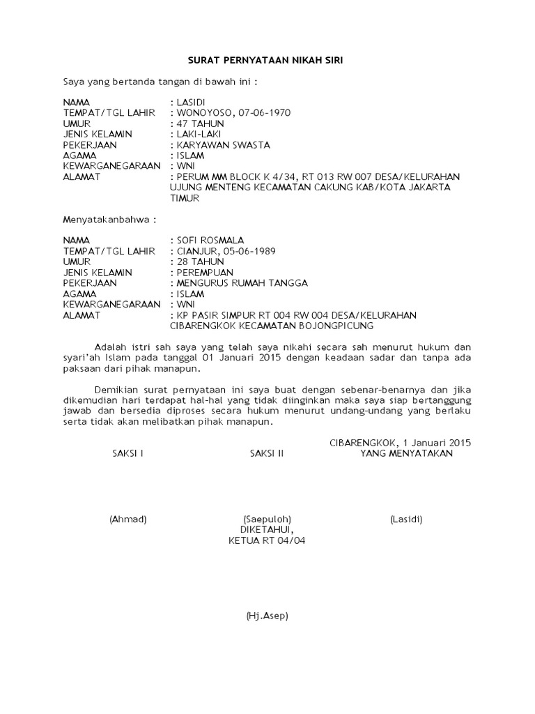 Surat nikah sirih oknum anggota dewan prabumulih tersebar luas. Yang bertanda tangan di bawah ini kami dari kedua belah pihak : Yang belum punya akta nikah, yang nikahnya secara siri ini ada surat keterangan nikah siri yang pasti sah dan halal link yang mungkin butuh file nya : Nah, di sini aku mau kasih contoh surat cerai nikah siri yang bisa kamu jadikan referensi. Bagaiamana cara membuatnya dan contoh surat cerai untuk anda gunakan diberbagai keperluan yang baik dan benar terlengkap. Pada artikel sebelumnya kita telah membahas mengenai contoh suarat pernyataan nikah siri. Dengan melakukan nikah siri, nikah sah secara agama namun tak memiliki legalitas dalam negara, segala sesuatu yang berkaitan dengan dalam artikel ini akan dibahas lengkap tentang apa itu nikah siri,contoh surat nikah siri, beserta hukum, syarat, tata cara, dan cara cerai dalam nikah siri. Beberapa poin penting tersebut di antaranya adalah: Karena efeknya yang begitu luar biasa terhadap kehidupan rumah tangga. Pdf legalitas nikah sirrî ditinjau dari kaidah fikih. Agen nikah di thailand 2019 agen contoh surat pernyataan cerai nikah siri contoh surat. Hukum cerai nikah siri, cara untuk mengajukan dan mendapatkan status cerai setelah melakukan nikah siri secara hukum agama dan hukum negara. Pernikahan siri dianggap sah di mata agama islam jika memenuhi lima rukun nikah yaitu adanya mempelai pria, mempelai wanita, wali nikah, dua orang saksi, dan diucapkannya.